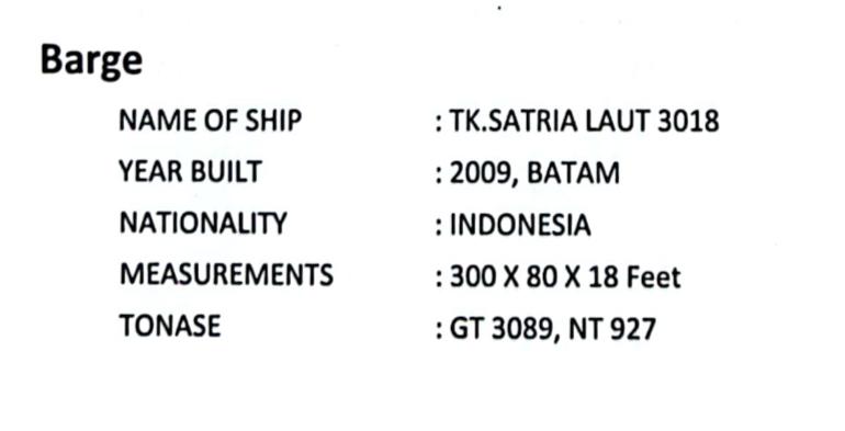 Kapal TK Satria Laut 3018, tahun 2009, ukuran 300x80x18 feet, GT 3089, NT 927